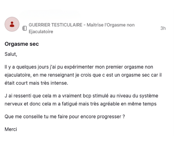 Sache qu'avec Guerrier Testiculaire, tu bénéficies d’un raccourci énorme : tu évites toutes les erreurs et gagnes plusieurs mois de progression. Ainsi, beaucoup d’hommes parviennent déjà à une maîtrise totale en seulement 3 à 6 mois.